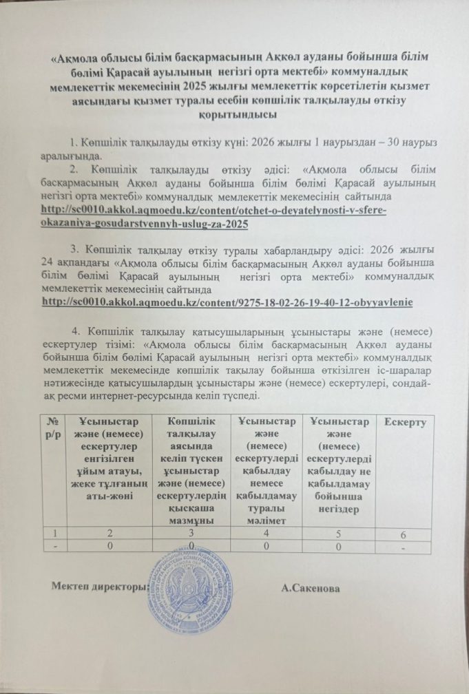 «Ақмола облысы білім басқармасының Ақкөл ауданы бойынша Қарасай ауылының негігі орта білім беретін мектебі» КММ 2023 жылғы мемлекеттік көрсетілетін қызмет аясындағы қызмет туралы есебін көпшілік талқылауды өткізу қорытындысы
